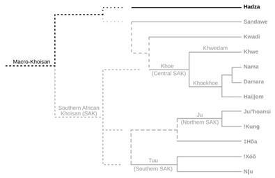 Keywords: Khoisan languages (Hadza highlighted).svg en Genetic relationships of the Khoisan click consonant-using languages with Hadza highlighted Solid lines indicate well attested relationships dashed and dotted lines are conjectural and contested After Cite journal Tishkoff S A et al 10 1093/molbev/msm155 History of Click-Speaking Populations of Africa Inferred from mtDNA and Y Chromosome Genetic Variation Molecular Biology and Evolution 24 10 2180 “2195 2007 own Joey Roe 2011-04-30 File Khoisan_languages svg Cc-zero Khoisan languages Click consonants |