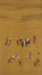 | Keywords: KhubilaiOnTheHunt.jpg en Liu Guandao Khubilai Khan on the Hunt Chinese no characters sorry for that Yuan Shizu chulie tu Paint and ink on silk Painted in 1280 now located in the National Palace Museum in Taipei 劉貫道 元世祖出猟図 軸 元・至元17年(1280) 絹 色 182 9 x 104 1 cm 台北市 国立故宮博物院 Attributed to Liu Guandao 劉貫道 / of the reproduction National Palace Museum in Taipei Institution National Palace Museum Dschingis Khan und seine Erben exhibition catalogue München 2005 p 299 1280 <gallery> File Liu-Kuan-Tao-Jagd JPG File Khubilai Khan Hunting-Detail of a Falconer png File Khubilai Khan Hunting-Detail of a Hunter with Cheetah png </gallery> PD-old-100 Paintings in the National Palace Museum Kublai Khan Paintings of mountains Hunting by horse in paintings Camels in art Paintings of the Yuan Dynasty Karst topography in Guangxi Ink and wash paintings in China Landscape paintings of China Scrolls of China Chinese literati paintings Chinese silk Ancient Chinese art Paintings from China Horse riding in Chinese art Collections of art in China Art from Asia 1280 paintings Liu Guandao |