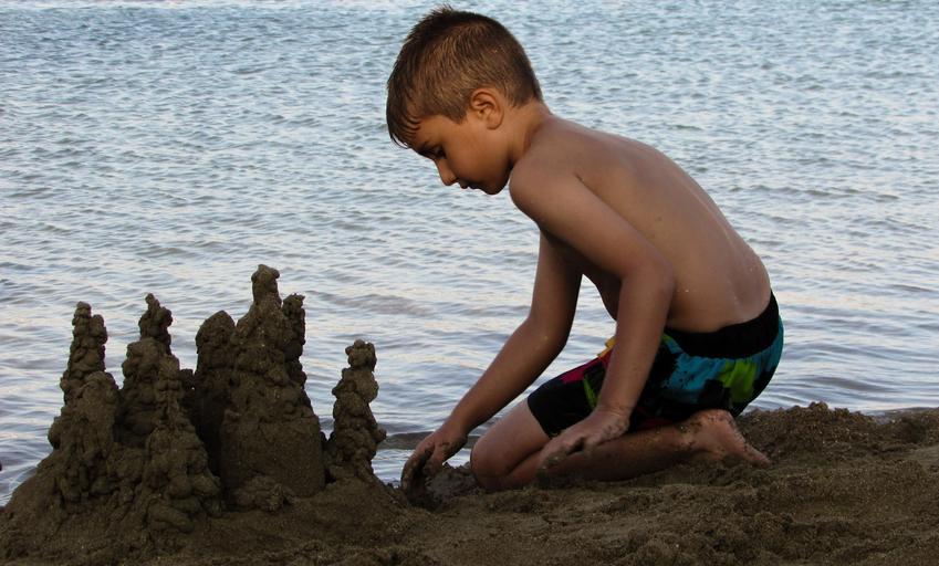 Keywords: kid boy playing child summer beach sand castle