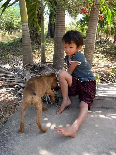 Keywords: kid dog feed feeding girl child friend accompany sit hungry