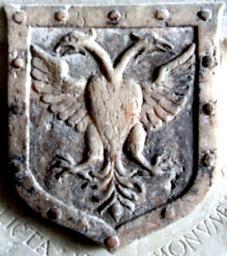 | Keywords: KilligrewArms ElizabethKilligrew ChittlehamptonChurch Devon.PNG en Arms of Killigrew of Cornwall Argent an eagle with two heads displayed sable a bordure of the second bezantee detail from Mural monument to Edmond Yeo d 1636 of Hawkridge Chittlehampton Devon erected by his widow Elizabeth Killigrew St Hieritha's Church Chittlehampton east wall of south transept Inscribed To the memorie of Edmond Yeo of North Petherwin Esqr who was borne and departed this life in this parish An n o D omi ni 1636 commending his godly loving wife of the noble family of the Kelligrews in Cornwall w i th two sonns and foure daughters living to God the Father of ye fatherles s defendor of ye cause of ye widow s Praemisimus non amisimus i e we have sent him ahead we have not sent him away Above is a shield showing the arms of Yeo Argent a chevron sable between three ducks azure impaling Killigrew Argent an eagle with two heads displayed sable a bordure of the second bezantee inscribed underneath on the frame Edmond Yeo under the dexter side Eliz Killigrew under the sinister side On the sides of the frame is inscribed in Latin left side Leon Yeo ducens uxorem Leonard Yeo taking as his wife right side filiam et haeredem Stapletoni the daughter and heir of Stapleton His wife was Gertrude Stapleton daughter and heiress of George Stapleton of Rempstone Nottinghamshire and widow of Baldwin Acland d 1572 of Hawkridge Chittlehampton At the bottom is a shield displaying Killigrew alone around which is inscribed in Latin Elizabetha vidua relicta hoc monument um maerens posuit Elizabeth widow left behind placed this monument sorrowing own photo Lobsterthermidor <span class signature-talk ></span> 15 34 7 May 2015 UTC 2014 St Hieritha Chittlehampton interior Wall mounted church monuments in Devon Killigrew arms Reliefs of coats of arms in England |
