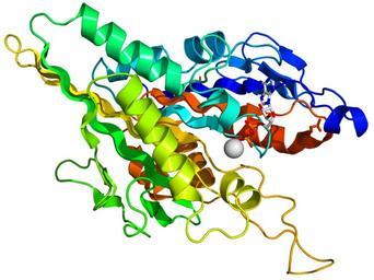Keywords: Kinesin motor domain 1BG2.png Crystallographic structure of the human kinesin motor domain depicted as a rainbow colored cartoon N-terminus blue C-terminus red complexed with ADP stick diagram carbon white oxygen red nitrogen blue phosphorous orange and a magnesium ion grey sphere <ref name pmid8606779 > 1BG2 ; cite journal Kull FJ Sablin EP Lau R Fletterick RJ Vale RD Crystal structure of the kinesin motor domain reveals a structural similarity to myosin Nature 380 6574 550 “5 1996 April 8606779 10 1038/380550a0 </ref> Own 2009-03-21 Boghog2 Ribbon diagrams |
