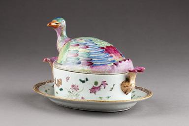 | Keywords: Kinesisk porslinskarott i form av and, från 1735-1795 - Hallwylska museet - 95872.tif LSH artwork sv TERRIN Med lock och fat; möjligen senare än Qianlong Karotten oval med rak profil plan botten samt på ändarna med utåtböjda flikiga handtag med vulstiga fästen Lock kupigt i form av en liggande and med huvudet vänt åt vänstra sidan; sarg låg Fat ovalt med nästan plan botten kälformig kep samt snett utstående rakt brätte Karott Med dekor av lotusblommor fiskar och andra blommor och vattenväxter Fat På insidan i botten en mandarinand färger som locket däromkring dekor som på karotten Glasyren med s k orangeskalsyta karottens bräddkant och lockets sarg oglaserade karotten och fatet på bottens utsida oglaserade original caption Kinesisk porslinskarott i form av and från 1735-1795 <br/> Nyckelord Fågel Fåglar Qianlong decade other date - 1750 1760 HWY place of origin CN original filename hm_dig12477 14819 inventory number HWY XLVIII X A e g 01 95872 CC-BY-SA Jens Mohr Qianlong Emperor Birds in art Chinese ceramics in the Hallwyl Museum Sweden Jens Mohr Media contributed by LSH 2014-11 |