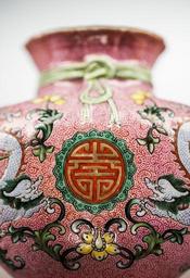 Keywords: Kinesisk porslinsvas med tecknet för långt liv, 1735-1795 - Hallwylska museet - 107704.tif LSH artwork sv HÄNGVAS ett par Vaserna är utformade som säckar med snören runt halsarna De är platta baktill och har hål för upphängning Halsens insida och baksidan är målade i turkost Framsidan har ett bakgrundsmönster med täta mörkt rosa slingor på en ljusare rosa grund med ett par femkloade drakar som står vända mot en medaljong som bär tecknet för »långt liv« Bakom och under drakarna finns en stiliserad lotusslinga Även om den inte är av absolut främsta kvalitet så har emaljmålningen utförts med omsorg och precision Stilen den kejserliga stämpeln och dekorationernas innehåll tyder på att porslinet tillverkats under det sena Qianlongväldet Det allra finaste godset av det här slaget från det tidiga Qianlongväldet finns i de kejserliga samlingarna i Taipei och Peking De har underglaserade blå märken medan de här vaserna har ett kejserligt märke i överglaserad röd emalj <br/>Pair of porcelain wall vases decorated in overglaze enamels Mark and period of Qianlong 1736-95 <br/>The vases are in the shape of bags with cords round their necks The backs of the vases are flat with a hole for suspension when used in a room or travelling in a sedan chair The inside neck and back are enamelled turquoise The front has a background pattern of dense dark pink scrolls on a lighter pink ground with a pair of five-clawed dragons confronting a central medallion containing the character for long life Behind and beneath the dragons is a stylised lotus scroll its central flower with upward-pointing stamen Although not of the very first quality the enamelling is done with care and precision The style and content of decoration indicate porcelain produced during the early Qianlong reign in the 1740s The very finest wares of this type in the imperial collections in Taipei and Beijing have underglaze blue marks while these vases have a reign mark in overglaze red enamel original caption Kinesisk porslinsvas med tecknet för långt liv 1735-1795 <br/> Nyckelord Kinesiska tecken Symboler Mytologi Porslin Kinesiskt porslin Qianlong 1700-tal - 1735 1795 porcelain size cm 6 9 mynning size cm 4 5 size cm 3 6 mynning size cm 3 5 fot size cm 13 size cm 12 4 size cm 7 8 fot HWY place of origin CN original filename hm_dig16552 14642 inventory number HWY XLVIII X A e s 01 107704 CC-BY-SA Jens Mohr <gallery caption Different images of same object > File Kinesisk signatur och museets föremålsnummer över - Hallwylska museet - 95864 tif File Hängvaser bakifrån tillverkad i Kina 1735-1795 - Hallwylska museet - 99429 tif File Hängvas undersidan - Hallwylska museet - 99431 tif File Kinesiska porslinshängvaser i rosa från 735-1795 med kinesiska tecknet shou långt liv - Hallwylska museet - 95863 tif File Hängvas undersidan 1700-tal - Hallwylska museet - 99432 tif File Hängvaser från Kina 1735-1795 - Hallwylska museet - 100472 tif File Baksida hängvaser från Kina 1735-1795 - Hallwylska museet - 100473 tif </gallery> Porcelain of China 18th-century art Signs Qianlong Emperor Mythology Chinese characters Vases Jens Mohr Media contributed by LSH dim-with multiple size templates Media contributed by LSH 2016-05 China in the 18th century
