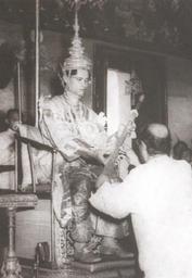 | Keywords: King Bhumibol coronation 2.jpg th พระบาทสม ด็จพระ จ้าอยู่หัวทรงรับพระแสงอัษฎาวุธจากพระมหาราชครู ในพระราชพิธีบรมราชาภิ ษก 1950-05-05 สแกนจากหนังสือ พระ จ้าอยู่หัว กรมวิชาการ กระทรวงศึกษาธิการ 2530 หน้า 6 สำนักพระราชวัง other versions Custom license marker 2016 10 15 PD-Thailand Bhumibol Adulyadej in 1950 |