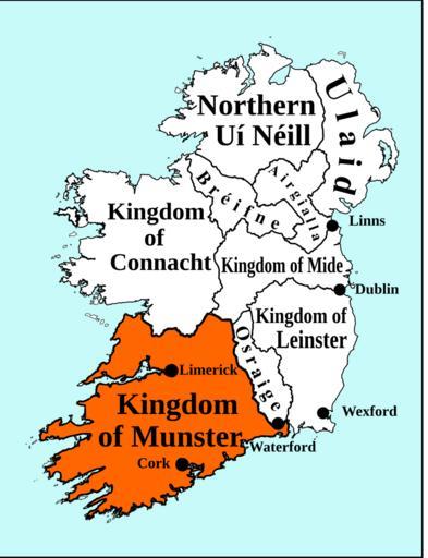 | Keywords: Kingdom of Munster-900.svg Created by User ZyMOS for http //historyatlas wikia com/wiki Wiki Atlas of World History Derived from en SVG map of Ireland circa 900 to accompany an article on Early Scandinavian Dublin containing place names territories and battlefields mentioned in that article Own Erigena 2009-05-14 Wiki Atlas of World History SVG maps of Ireland Maps of the history of Ireland Maps showing 10th-century history Kings of Munster | ||||