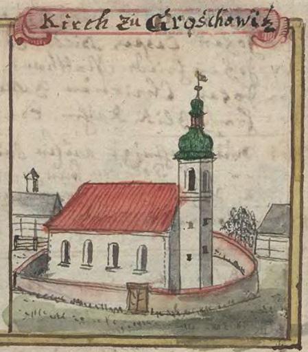 | Keywords: Kirche Groschowitz.JPG de Kirche in Groschowitz in Oberschlesien Silesia in Compendio seu Topographia das ist Praesentatio und Beschreibung des Herzogthums Schlesiens Pars I http //www bibliotekacyfrowa pl/dlibra/docmetadata id 15414 Link Creator Friedrich Bernhard Werner century 18 PD-old-100 Church of Saint Catherine of Alexandria in Opole-Groszowice |