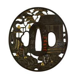 | Keywords: Kitagawa Soten - Tsuba with the Story of Shûtendôji - Walters 51299 - Back.jpg This tsuba may depict part of the story of Shûtendôji who was a monstrous ogre killed by Minamoto no Yorimitsu in 947 Shûtendôji was born human but his constant drinking and bad temper turned him into an ogre He and his followers devastated the area around their home and took maidens as prisoners The Emperor Murakami sent Yorimitsu also known as Raigô and four of his retainers to kill Shûtendôji They were helped in this task by the spirit of Sumiyoshi who appeared to them in the form of an old man The old man gave Yorimitsu a golden cap to wear for protection and a magical rope to bind the ogre This tsuba shows Yorimitsu and his men dressed as traveling priests while they look for Shûtendôji The tsuba is a pair with 51 300 century 19 late Edo shibuichi details of gold and copper cm 7 53 7 0 45 accession number 51 299 2398 Henry Walters Baltimore date and mode of acquistion unknown Walters Art Museum Henry Walters Acquired by Henry Walters Signature Forged Sôheishi/Nyûdô Sôten sei; Translation Made by Sôheishi Nyûdô Sôten; Place Gôshû/Hikone ju; Translation Residing in Hikone Gôshû province place of origin Japan Walters Art Museum license Tsuba in the Walters Art Museum Media contributed by the Walters Art Museum needs category review Kitagawa Soten |