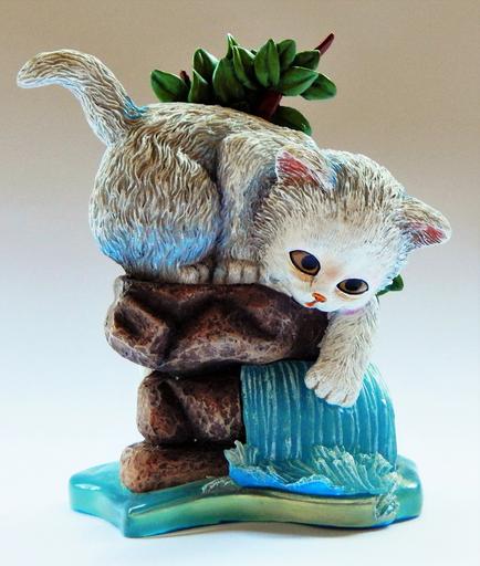 Keywords: kitten kitty cat figurine waterfall curious animal cute feline pet fur fluffy playful cute cat adorable happy sweet fun cheerful statue playing