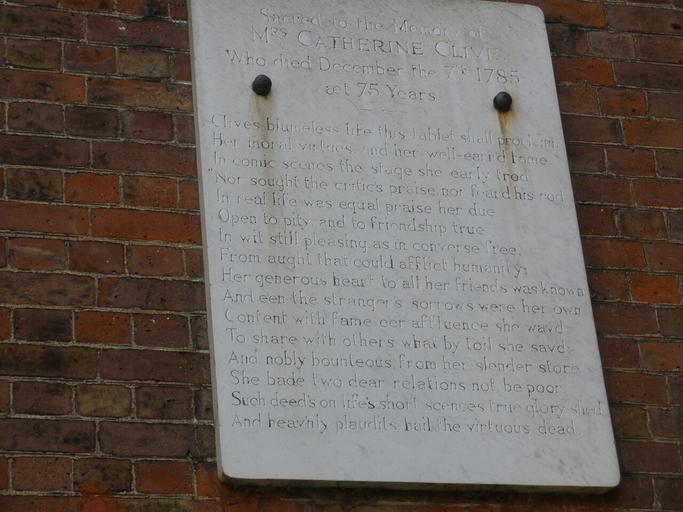 Keywords: Kitty Clive's Epitaph.jpg en Epitaph on Kitty Clive's grave in St Mary's Church graveyard at Twickenham 1785 http //www gravestonephotos com/public/gravephoto php grave 134361 requestee 41004 scrwidth 1300 author other versions All the legible names shown on the Catherine Clive grave monument GPR grave number 134361 St Mary the Virgin's Church Cemetery Twickenham Middlesex England full name age birth year burial year relationship/notes Catherine Clive 75 1710-1785 PD-old-100-1923 Uploaded with UploadWizard Kitty Clive |