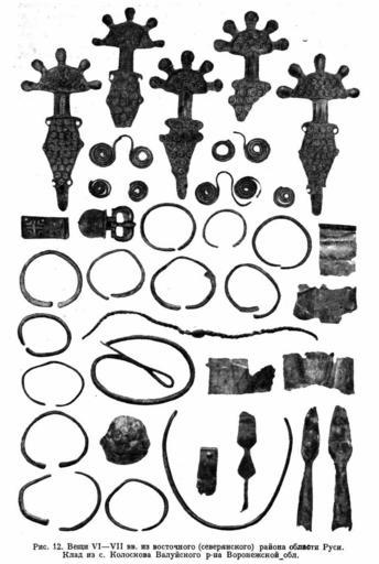 | Keywords: Klad Koloskovo foto.png ru Колосковский клад Госуда ственный исто ический музей К воо ужению и одежде воина относятся два небольших железных втульчатых копья се еб яная п яжка со щитком ге альдической фо мы и п о езная се еб яная бляшка для емня Остальные вещи относятся к нескольким аз озненным женским набо ам ук ашений Имеется пять пальчатых фибул щитки кото ых ук ашены ци кульным о наментом много целых и поломанных б онзовых б аслетов с ха акте ными асши енными концами часть г ивны и д угие вещи 2014-11-21 Рыбаков Б А Д евние усы // Советская а хеология жу нал «Издательство Академии наук СССР» 1953 XVII С 65 author other versions Custom license marker 2014 11 20 PD-Russia Uploaded with UploadWizard Valuyki |