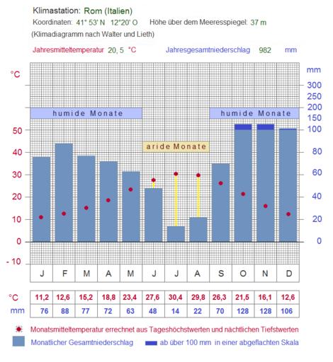 Keywords: Klimadiagramm von Rom (Italien).png de Klimadiagramm von Rom Italien 2016-03-14 own Geo-Science-International other versions cc-zero Climate diagrams W+L of Italy German