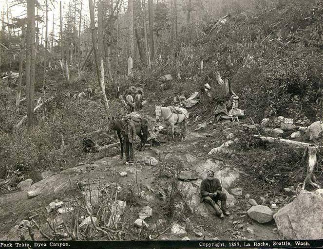 Keywords: Klondikers with packtrain on the Chilkoot Trail, Alaska, 1897 (LAROCHE 118).jpeg check categories 8 June 2016 4 Photograph Creator Frank La Roche Caption on image Pack train Dyea Trail c1897 Pack train Dyea Canyon This is a magnificient piece of scenery if regarded purely from a natural point of view The unrestrained elements have produced a state of chaos; and through the wooded gulch the human trail wends its way and man in quest of wealth and honor defies the forces of nature Great boulders of rock and piles of broken timber bestrew the line of march and great care has to be exercised in picking out one's footsteps and also those of the beasts of burden Accidents are not by any means a rarity; but with the necesary amount of care there is no occasion for any serious mishaps unless the weather be unpropious Fine weather prevailed when this photograph was taken Frank La Roche En Route to the Klondike 1898 Klondike Gold Rush Subjects LCTGM Pack animals--Alaska; Horses--Alaska Subjects LCSH Chilkoot Trail; Trails--Alaska depicted place Alaska 1897 Institution University of Washington UWASH-LAROCHE-source accession number laroche 118 PD-old-auto-1923 1936 Information field Order Number LAR259 Images from the Frank La Roche Photographs Collection to check Pack animals Horses Chilkoot Trail Trails |