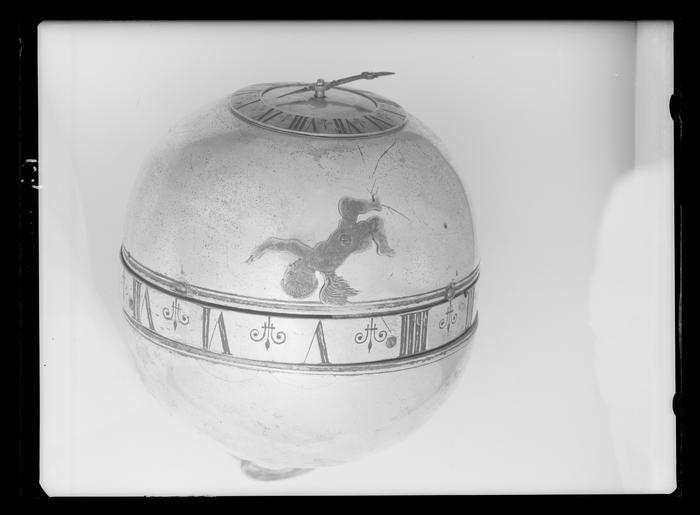 | Keywords: Klotur - Livrustkammaren - 35359.tif Klotformigt ur med loddrift där urhuset utgör lodet Sammansatt av tre delar 1 undre halvan av slät förgylld koppar blytyngd på bottnens insida på utsidan cirkelformig tavla av mässing med sifferring av silver graderad I-XII visare av stål I överkanten 4 hål för fastskruvning av urveket 2 Övre halvan likaså av förgylld koppar upptill hank med nitade öglor allt av mässing Vid hanken 4 skruvhål samt rektangulärt hål 13x7 mm <br/><br/>I nederkanten rund silverplatta graderad 1-3 4 syns ej med hål för uppdragningsaxel 3 Urverk nästan helt av mässing med roterande förgylld sifferring graderad I-XII synlig mellan de två halvorna visare i form av ängel fastskruvad vid nedre halvan Uret hänger i vaxat snöre upplindat runt spiralaxel i snörets andra ände tillplattad oval ring av mässing På övre halvan märkning med röd färg 3937 original caption klotur - LRK 191 ca 1700 steel - silver - brass - copper - lead g 1251 size mm 119 108 LRK Stanislaus I av Polen kung Människan och tiden 1989 Människan och tiden 1990 Kunglig tid 1999 place of origin original filename LN_B08274_011154 36768 inventory number LRK 191 35359 CC0 Klotur - Livrustkammaren - 35359-negative tif Media contributed by LSH without any categories Media contributed by LSH unmatched objKeyword Media contributed by LSH 2013-10 |