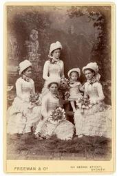 | Keywords: st mark's church, darling point stmarkschurchdarlingpoint wedding bridesmaids five women girls gowns hats bouquets 1880s 1882 fashion whitedress sydney photo border outdoor Format: Cabinet photograph Find more detailed information about this photographic collection: acms.sl.nsw.gov.au/item/itemDetailPaged.aspx?itemID=442277 From the collection of the State Library of New South Wales : www.sl.nsw.gov.au/ Format: Cabinet photograph Find more detailed information about this photographic collection: acms.sl.nsw.gov.au/item/itemDetailPaged.aspx?itemID=442277 From the collection of the State Library of New South Wales : www.sl.nsw.gov.au/ |