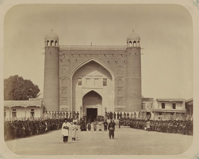 Keywords: Kokand Khanate. Gate of the Kokand Palace in the City of Kokand. Exterior View, with Soldiers of the Kokand Khan's Army Standing Outside the Entrance WDL10730.png Artwork ru Кун Александ Людвигович 1840 1888 гг fr Kun Aleksandr L 1840-1888 en Kun Aleksandr L 1840-1888 zh 亚历山大·L· ,1840-1888 年 pt Kun Aleksandr L 1840-1888 ar كُن، ألكسندر ل ، 1840-1888 es Kun Aleksandr L 1840-1888 ru Кокандское ханство Во ота ханского дво ца в го оде Коканде Вид сна ужи - солдаты а мии кокандского хана стоят пе ед входом fr Khanat de Kokand Porte du palais de Kokand dans la ville de Kokand Vue extérieure avec des soldats de l'armée du khan de Kokand se tenant devant l'entrée en Kokand Khanate Gate of the Kokand Palace in the City of Kokand Exterior View with Soldiers of the Kokand Khan's Army Standing Outside the Entrance zh 浩罕汗国 浩罕城浩罕宫殿大门 外景,浩罕汗军队的士兵 宫殿入口外把守 pt Canato de Kokand Portão do palácio de Kokand na cidade de Kokand Vista externa com soldados do exército do khan de Kokand do lado de fora da entrada ar خانات خوقند بوابة قصر خوقند في مدينة خوقند منظر خارجي، حيث يظهر جنود جيش خان خوقند واقفين خارج المدخل ru Эта фотог афия входит в этног афическую часть <em> Ту кестанского альбома </em><em></em>  всесто оннего исследования Цент альной Азии п едп инятого после того как в 1860-х годах в егионе установилось господство Российской импе ии Альбом созданный по аспо яжению гене ала Константина Пет овича фон Кауфмана 1818 1882 годы пе вого гене ал-губе нато а оссийского Ту кестана состоит из четы ех частей в шести томах «Часть а хеологическая» два тома «Часть этног афическая» два тома «Часть п омысловая» один том и «Часть исто ическая» один том Основным составителем альбома был оссийский востоковед Александ Людвигович Кун аботавший совместно с иколаем Венедиктовичем Богаевским В альбоме п едставлено около 1200 фотог афий а также а хитекту ные планы аква ельные исунки и ка ты «Часть этног афическая» включает в себя 491отдельную  фотог афию на 163 листах а фотог афиях изоб ажены п едставители азличных на одов егиона листы 1 33 повседневная жизнь и итуалы листы 34 91 а также виды де евень и го одов уличные то говцы и комме ческая деятельность листы 92 163 <br>Замки и дво цы; Этног афические фотог афии; Исламская а хитекту а; Ко оли и п авители; Фотог афические исследования; Солдаты; Тю кские на оды fr Cette photographie est extraite de la partie ethnographique de l'<em>Album du Turkestan</em> étude visuelle complète de l'Asie centrale entreprise après que l'Empire russe prit le contrôle de la région dans les années 1860 Commandé par le général Konstantin Petrovich von Kaufman 1818 1882 premier gouverneur général du Turkestan russe l'album est composé de six volumes en quatre parties  la partie archéologique deux volumes la partie ethnologique deux volumes la partie sur les métiers un volume et la partie historique un volume L'album fut essentiellement compilé par l'orientaliste russe Aleksandr L  Kun assisté de Nikolai V  Bogaevskii Il comporte près de 1200 photographies et inclut également des plans architecturaux des dessins à l'aquarelle et des cartes La partie ethnographique compte 491 photographies sur 163 planches montrant des individus des différentes peuplades de la région planches 1 à 33 des scènes de la vie quotidienne et des rites planches 34 à 91 ainsi que des vues de villages et de villes de vendeurs ambulants et d'activités commerciales planches 92 à 163 <br>Châteaux et palais; Photographies ethnographiques; Architecture islamique; Rois et dirigeants; Inventaires photographiques; Soldats; Peuples turciques en This photograph is from the ethnographical part of <em>Turkestan Album</em><em> </em>a comprehensive visual survey of Central Asia undertaken after imperial Russia assumed control of the region in the 1860s Commissioned by General Konstantin Petrovich von Kaufman 1818 82 the first governor-general of Russian Turkestan the album is in four parts spanning six volumes Archaeological Part two volumes ; Ethnographic Part two volumes ; Trades Part one volume ; and Historical Part one volume The principal compiler was Russian Orientalist Aleksandr L Kun who was assisted by Nikolai V Bogaevskii The album contains some 1 200 photographs along with architectural plans watercolor drawings and maps The Ethnographic Part includes 491 individual photographs on 163 plates The photographs show individuals representing the different peoples of the region Plates 1 33 ; daily life and rituals Plates 34 91 ; and views of villages and cities street vendors and commercial activities Plates 92 163 <br>Castles and palaces; Ethnographic photographs; Islamic architecture; Kings and rulers; Photographic surveys; Soldiers; Turkic peoples zh 这张照片出