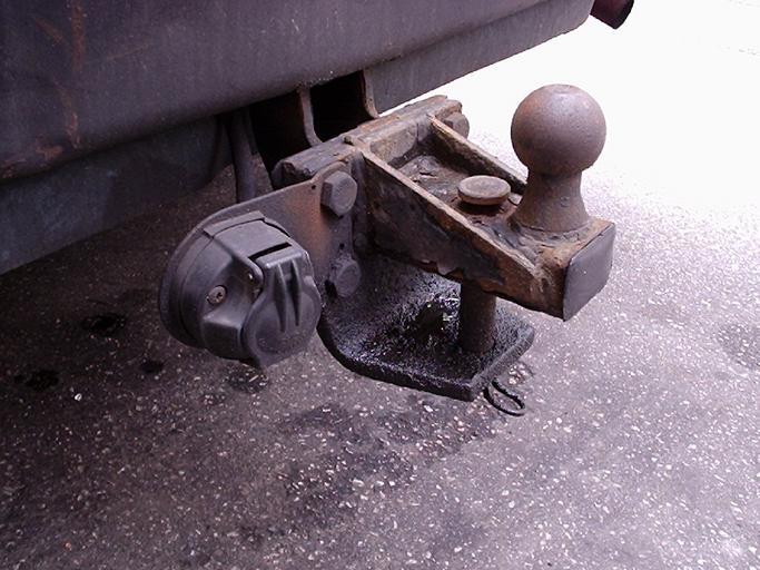 Keywords: Kombi anhængertræk med stik.JPG Kombineret anhængertræk med kuglekobling og skurvognstræk Kuglen kaldes ofte en jydekrog og skurvognstrækket er den tykke bolt med en split på undersiden der sidder en tand længere nede end kuglen Ved siden af ses et 12 volt stik til lys m m på anhængeren Combined trailer coupling device please insert technical words for ball and pin and 12 volt 7 pin socket for light on trailer PD by G®iffen Road vehicle couplers Ball head couplings