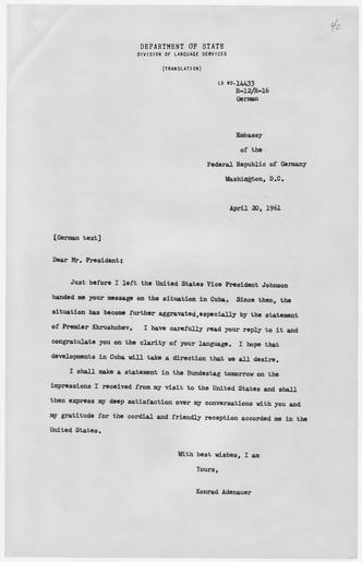 | Keywords: Konrad Adenauer Letter to John F. Kennedy April 20, 1961 - NARA - 193658.tif Scope and content Department of State translation of letter from Chancellor Adenauer to President Kennedy on situation in Cuba General notes 193658 Local identifier President 1961-1963 Kennedy Office of the Personal Secretary 1961 - 1963 NARA-Author Adenauer Konrad 1876-1967 Author 1476282 <br /> Cuba North and Central America nation 4186389 21 5 -80 <br /> Germany Europe nation 4176772 51 5 10 5 <br /> John F Kennedy Library NLJFK Columbia Point Boston MA 02125-3398 1961-04-20 Record group Collection JFK-POF Papers of John F Kennedy President's Office Files 01/20/1961 - 11/22/1963 Record group ARC 1166 Papers of President Kennedy President's Office Files Countries compiled 01/20/1961 - 11/22/1963 Series ARC 193654 File unit John F Kenendy President's Office Files Countries Germany General 01/1961 - 11/1963 File unit ARC 193655 Variant control numbers NAIL Control Number NLK-POF-CNTRYS-GERMANYGEN-6BBB yes Other versions <gallery> File Konrad_Adenauer_Letter_to_John_F _Kennedy_April_20 _1961_-_NARA_-_193658 tif tif File Konrad_Adenauer_Letter_to_John_F _Kennedy_April_20 _1961_-_NARA_-_193658 jpg jpg </gallery> NARA-cooperation PD-USGov NARA TIF images with categorized JPGs |