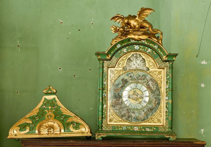 Keywords: Konsolur, pendelur, foder av grönmålad furu med blom- och bladrankor i guld, silver, rött och blått - Skoklosters slott - 92376.tif LSH artwork Johann Eichstedt urmakare sv Dörr med glas Smala balustrar vid sidorna Halvrunt krön På ovansidan fastskruvat en skulpterad förgylld drake hållande fackla och pil <br/>Försilvrad cirkelformad urtavla med romerska timsiffror och kvartstimmesmarkeringar Timvisare av mässing fastsatt vid silvermedaljong med lieman i relief till vänster därom mindre medaljong med gosse blåsande såpbubblor till höger sovande gosse och timglas <br/>Runt urtavlan cirkelskiva av papp med personifikationer av solsystemet Apollon Venus Merkurius Månen Saturnus Jupiter Mars målade i flera färger Över cirkelskivan driven försilvrad mässingsbricka med hjälmkrönt fyrstyckad vapensköld en fågel stående åt vänster i varje fält Under vapnet stämplat EK Ephraim Kegenwart 1720-58 samt två kryss I svicklarna runt cirkelskivan förgyllda fastskruvade ornament <br/>Runt hus för urverket På urverket tre uppdragningsaxlar hjul för släphaksgång timkugghjul gjutna graverade beslag av förgylld mässing m m Liten pendel med mässingslod i ståltråd När pendeln svänger rör sig fyra små putti på två stålpinnar i rundeln innanför urtavlan Denna inre rundel täcks av celluloid Huset och det runda partiet runt om bemålat med naturalistiska rosor och tulpaner mot röd grund på locket en fågel <br/>Fodret skärt på insidan Bakre dörr på gångjärn Nyckel saknas <br/>Bronserade handtag på fodrets sidor <br/>Klockan har suttit förankrad med järnstång och en krok vid en vägg <br/>En nyckel till urverket En rostig nyckel till främre dörren<br/>Urverket signerat Johan Eichstedt Danzig <br/>Uret 1600- talets senare hälft fodret 1700- talets andra fjärdedel original caption Konsolur pendelur foder av grönmålad furu med blom- och bladrankor i guld silver rött och blått 1650-1675 <br/> Nyckelord Klocka 1600-tal Ur - 1650 1675 size mm 63 225 103 SKO E K place of origin original filename sm_dig9513 24503 inventory number SKO 3190 92376 CC-BY-SA Margareta Gaik Watches Margareta Gaik Media contributed by LSH unmatched creator Media contributed by LSH 2014-11 |