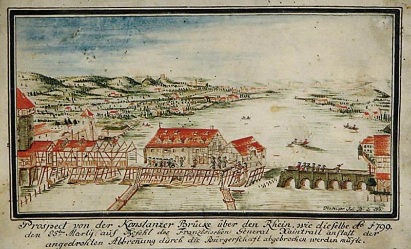| Keywords: Konstanzer Brücke 1799 Abbruch.jpg Prospect von der Konstanzer Brücke über den Rhein wie dieselbe 1799 den 25 Marty auf Befehl des französischen GeneralHaintrail anstatt der angedrohten Abbrennung durch die Bürgerschaft abgebrochen werden musste by Johann Baptist de Lob k u k Bombardier Drawing and watercolours 1799 ca 10 x 16 cm PD-art Source http //www henrys de/ Historic views of Konstanz Bridges in art 1799 Lake Constance in art Artworks missing infobox template Rheinbrücke Konstanz |