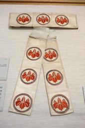Keywords: Koshiobi Sash, Edo period, 18th century, paulownia roundel design on white ground - Tokyo National Museum - DSC06141.JPG en Exhibit in the Tokyo National Museum Tokyo Japan This artwork is old enough so that it is in the public domain 2013-09-03 00 49 00 own Daderot cc-zero Nō costumes in the Tokyo National Museum Uploaded with UploadWizard |