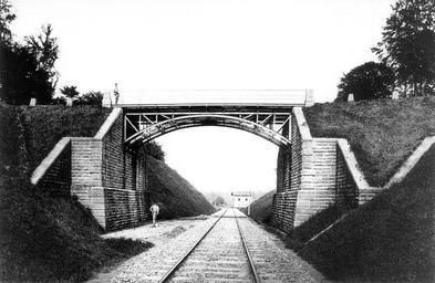 Keywords: Kraichgaubahn Bauerbach 1879.jpg <br /> Straßenüberführung über die Kraichgaubahn im Wald bei Bauerbach nach der Fertigstellung 1879 Kraichgaubahn road bridge near Bauerbach 1879 Generallandesarchiv Karlsruhe Die Kraichgaubahn - 21 Ansichten der Durlach-Eppinger Bahn scan from Scharf Die Eisenbahn im Kraichgau 1879 details unknown Author PD-old Railway bridges in Landkreis Karlsruhe Iron truss railway bridges in Baden-Württemberg Iron deck truss arch bridges Iron truss arch bridges in Germany Kraichgaubahn |
