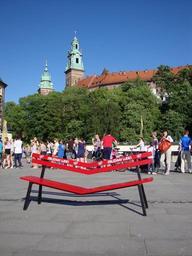 Keywords: kraków poland bench view tourism red funny tourists