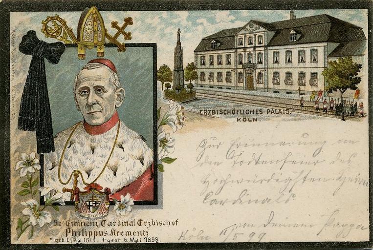 | Keywords: Krementz1.jpg de Erzbischofliches Palais Köln -Cardinal Erzbischof Philippus Krementz Kölner Kunstverlag Hailsaring 89 loki11 1899 PD-old Philipp Krementz Lithographs Postcards of Cologne Clerics with ermine garment Coats of arms of archbishops of the Roman Catholic Archdiocese of Cologne Coats of arms of cardinals of Germany |