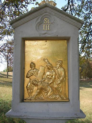 Keywords: Kreuzweg Frauenberg (Eichstätt) -03.jpg Frauenbergkapelle 14 Bildstöcke ehemals mit Gusseisenreliefs 1856; in ab 1875 angepflanzter Kastanienallee own WaldiWuff 2012-08-15 Kreuzweg Frauenberg Eichstätt 03 Station 3 Jesus falls the first time Germany Bavaria Eichstätt Cc-zero |