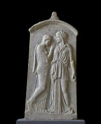 Keywords: Krito Timarista stele Rhodes.jpg 36 26 41 2 N 28 13 37 5 E Kameiros site of Makry Langoni The dead mother Timarista and her daughter Krito are represented standing and embracing The shape of the stele with its unusual arched finial the tender rendering of the figures in bas-relief and the emotional intensity of the scene reveal the work's ionic character from Phidias inspiration Marble 420-410 BCE Camiros Timarista la mère défunte et sa fille Krito sont représentées debout et s'embrassant La forme de la stèle et le fleuron sommital inhabituel le rendu des personnages en bas-relief et l'intensité émotionnelle de la scène caractérisent un travail ionique inspiré de Phidias Marbre 420-410 avant notre ère Institution Archaeological Museum of Rhodes own Jebulon 5th century BCE 14 avril 2011 for photograph Cc-zero QualityImage Gravestones in Greece Ancient Greek sculptures in the Archaeological Museum of Rhodes Ancient Greek reliefs in Rhodes Standing women in art 420s BC reliefs in Greece Rhodes Art of Kameiros Quality images by Jebulon |