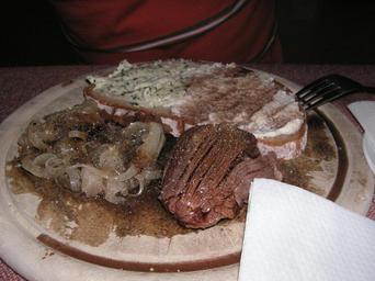 Keywords: Kronfleisch 8.jpg Kronfleisch skirt steak a traditional bavarian dish Served with onion rings rye bread composed butter with herbs and garlic and horseradish Own 2007-08-07 Alcibiades Kronfleisch Rye bread Horseradish