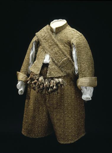 | Keywords: Kröningsdräkt - Livrustkammaren - 38844.tif LSH artwork sv Förmodligen tillverkad i Frankrike Buren av Karl X Gustav 1622-1660 i samband med kröningen <br/>I 1671 års inventarium står En Klädningh som är gjord till H K Maij tz Lÿcklige Cröningh och sägs omfatta följande plagg nämligen kappa tröja byxor knäband skorosor och handskar I 1654 års klädkammarräkning förtecknas dräkten under nr 3 på följande sätt 1 klädning och kappa av filemort gul oskuren sammet helt broderad med guld och med 140 diamantknappar till tröjan och byxorna 1 par strumpeband och skoband av rik guldbrokad helt broderade med guld 1 par underbyxor av incarnadie rosa taft och silkesstrumpor av samma färg 1 guldbroderat med guld och stofferade med guldbrokad 1 panasch plym av couleur de feu röda filemort och aurorafärgade fjädrar 1 par förgyllda sporrar och 1 värja med förgyllt fäste <br/>Nu finns endast tröjan och byxorna i behåll i sitt skick som dräkt medan den stora rundskurna kappan inte längre omtalas i inventarierna efter 1691 1704 års inv säger inget om kappan men den finns förvandlad till mässhake och altarbrun i Riddarsholmskyrkan Skänkta dit den 1 april 1705 av Riksänkedrottningen Hedvig Eleonora Mässhaken Gjord av tjock gul rips OBS Fel Enl Sveriges kyrkor skall vara sammet oskuren ett material som skiljer sig från såväl tröjans som byxornas Broderad med mönster i guld på samma sätt som på tröjan och byxorna Mönsterrapport 8 x 8 cm Såväl fram- som bakstycket består av 2 hopsydda våder av c a 40 cm bredd max längd ca 90 cm Drottningens namnchiffer HRS samt ANNO 1705 har broderats på respektive fram- och baksidorna <br/>Tröjan är sydd av vad man med ett modernt namn skulle beteckna som guldlamé som helt täckts med guldbroderi Den är av s k innocenttyp d v s ett relativt kort livplagg med planschetter inlagda som styvnad i framstyckenas snibbiga främre hörn försett med 10 små skört ståndkrage och relativt korta ärmar med öppna sömmar framtill På vänster framstycke har 17 st 2 cm knapphål sytts med jämna mellanrum ca 1 cm från kanten Vad man bör lägga märke till är att tröjan sytts av ett större antal stycken som skarvats samman Förmodligen har plagget antingen redan varit i tidigare bruk före kröningen 1654 och blivit något förtrångt eller också har man misslyckats med passformen vid tillfället i fråga och har varit tvungen att göra en del ändringar Möjligheten att tröjan kan ha förändrats vid något senare tillfälle kan man inte heller bortse ifrån <br/>Bottenmaterialet består nämligen av två skilda lamétyger ett något gulare i de smalare skarvarna och f ö ett något rödare det egentliga materialet Tröjan är huvudsakligen skuren i 2 framstycken 2 ryggstycken samt 2 ärmstycken till vardera ärmen 10 skört samt krage Man kan alltså visa att framstyckena måste skarvas med remsor av det gulare tyget utefter de raka framkanterna samt även i sidsömmen I halsringningen har en liten kil satts in mellan det vertikala skarvstycket fram och axelsömmen Bakstyckena ha fått var sin vertikala skarv knappt 4 cm bred mitt i ryggen på ömse sidor om mittsömmen Utefter ärmarnas öppna långsidor har vertikala stycken fogats till och nere vid ärmens avslutning har på undersidans stycken en smal horisontell remsa sytts På överärmstycket däremot har en horisontell skarv satts in överst uppe vid ärmringningen Kragen är också uppklippt baktill och försedd med 2 små skarvstycken Det 3 e skörtet på varje sida är eventuellt nysytt ty dess färg förefaller ljusare broderiet är klumpigare och kompositionen annorlunda mot alla de övriga 8 som exempelvis har den lilla blomman nedtill i mitten <br/>Mönstret har i någon mån missuppfattats i de senare sydda styckena så har man t ex lagt krepiner och trådar i båge i stället för att klippa av dem och börja med en ny tråd Ärmarnas nedersta parti mellan 3 5-7 cm är lämnat utan broderi beroende på att det ju skulle vikas till uppslag Ärmarna har inga knappar eller knapphål intill sprunden vid handlederna I midjan sitter på insidan under skörten 8 st små tampar med vardera 2 hål för byxornas hakar Guldlamén har en vådbredd av minst 31 cm utan stad 45x15 tr/cm2 Varje inslag består av gult silke med 2 och 2 smala trinda guldtenar på rätan <br/>Analysresultat <br/>Metalltråd tvinnad med textiltråd huvudbeståndsdelar <br/>Silver xxx<br/>Guld x<br/>Koppar xxx<br/>Zink 0<br/>Det yttäckande läggsömsbroderiet består av kantiljer av trinda tenar och platta lan av olika bredd snodder med silkeskärna omtvinnade med guldlan strängar dragna av trinda tenar av guld eller silver som stansats ut i spiraler eller öglor och manglats platta på halva sidan här benämnda spiral- eller paljett strängar i brist på befintlig terminologi och 2 och 2 tätt liggande strängar med trinda smala guldtenar virade runt ett bredare guldanklätt snöre etc Broderiet är nersytt med gult silke Mönsterraporten är 6 5x6 5 cm Mönstret Ur 2 från varandra utåtböjda palmkvistar som strax nedanför mitten sammanhålles med en uppåtböjd båge växa omväxlande 5- och 8-flikiga icke naturalistiska blommor upp <br/>Analysresultat <br/>Metalltrådsbroderi huvudbeståndsdelar <br/>Silver xxx<br/>Guld xxx<br/>Koppar xxx<br/>Zink 0<br/>Tröjan är garnerad med en 2 3 cm bred knypplad uddspets av guldtråd med 2 inlagda guldlan Mönsterrapporten är c a 2 5 cm Spetsen sitter på bägge främre ytterkanterna knapparna har alltså suttit ovanpå spetsen och fortsätter därifrån omedelbart runt de 2 främre skörten Vidare sitter det spets runt de 3 ytterkanterna av varje skört på axel-och sidsömmarna runt ärmhålen och längs de öppna ärmsömmarna sprunden Den ursprungliga knäppningen finns inte längre kvar diamantknapparna lät änkedrottningen ta ur och använda för annat ändamål Numera knäppes tröjan med hyskor och hakar Av vissa spår 