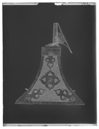 Keywords: Krutflaska - Livrustkammaren - 36449-negative.tif LSH artwork sv Trapetsformigt kruthorn med stomme av trä överklädd med läder beslag av stål På framsidans mitt ett genombrutet fyrpass med x-skåra Två hörnbeslag och ett upp-till i trepassform alla genombrutna På sidofälten raka beslag med vardera två skruvhål På baksidan en bärhake Krutmätt av stål med inre och yttre slutning Hävarmarna har skårar Rundad fjäder på locket pip h 74 mm original caption krutflaska -LRK 2939 - 1550 1600 steel e0 material stål - leather e0 material läder - wood e0 material trä g 570 size mm 205 size mm 53 size mm 174 LRK Westfaliska freden-utställningen place of origin original filename LN_E00810 39549 inventory number LRK 2939 36449 CC0 Krutflaska - Livrustkammaren - 36449 tif Gunpowder flasks images from Livrustkammaren |
