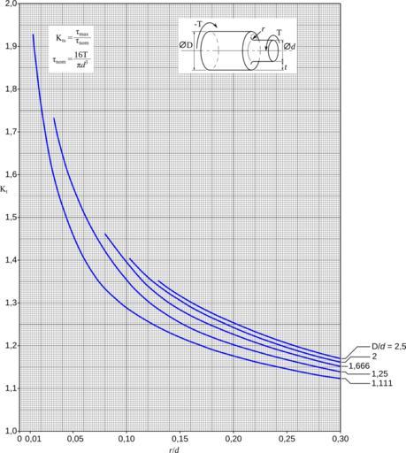 | Keywords: Kt arbre epaule torsion.svg  fr Abaque de facteurs de concentration de contrainte K<sub>t</sub> dans le cas d'un arbre épaulé en torsion en Stress concentration factors K<sub>t</sub> chart for a shaft with shoulder fillet in torsion 2013-04-24 11 31 46 own from Pilkey Walter D Peterson's Stress Concentration Factors 2<sup>nd</sup> ed Wiley sons 1997 ISBN 97-0-471-53849-3 p 166 Cdang inkscape cdang ; Calculation <math>\mathrm K_t \mathrm C _1 + \mathrm C _2 \alpha + \mathrm C _3 \alpha 2 + \mathrm C _4 \alpha 3</math> <math>\alpha \frac 2t \mathrm D </math> t is the fillet height t D - d /2 wikitable + Coefficient for the calculation of K<sub>t</sub> - β t/r scope col 0 25 ‰¤ β ‰¤ 4 0 - scope row C<sub>1</sub> <math>0 905 + 0 783 \sqrt \beta - 0 075 \beta</math> - scope row C<sub>2</sub> <math>-0 437 - 1 969 \sqrt \beta + 0 553 \beta</math> - scope row C<sub>3</sub> <math>1 557 + 1 073 \sqrt \beta - 0 578 \beta</math> - scope row C<sub>4</sub> <math>-1 061 + 0 171 \sqrt \beta - 0 086 \beta</math> scilab source <source lang scilab >// // Initialisation // clear; clc; // // Fonctions // // Saisie des paramètres géométriques function A param_geo A 1 input grand diamètre D ; A 2 input petit diamètre d ; A 3 input rayon r ; endfunction // Calcul en torsion function Kt Kt_torsion Alpha Beta coefs 0 905 0 783 -0 075; -0 437 -1 969 0 553; 1 557 1 073 -0 578; -1 061 0 171 0 086; C coefs 1 + coefs 2 sqrt Beta + coefs 3 Beta; polynome poly C' x c ; Kt horner polynome Alpha ; endfunction // // Programme principal // // Accueil disp Facteurs de concentration de contrainte dun arbre épaulé disp W D Pilkey Petersons Stress Concentration factors Wiley sons 1997 // A 1 D ; A 2 d ; A 3 r A param_geo ; t 0 5 A 1 - A 2 ; // hauteur de filet Beta t/A 3 ; // t/r Alpha 2 t/A 1 ; Kt_to Kt_torsion Alpha Beta ; if Beta < 0 25 Beta > 4 then disp Torsion attention valeur extrapolée ; end disp 'Kt torsion '+string Kt_to ; </source> cc-zero Uploaded with UploadWizard Stress concentration Torsion |