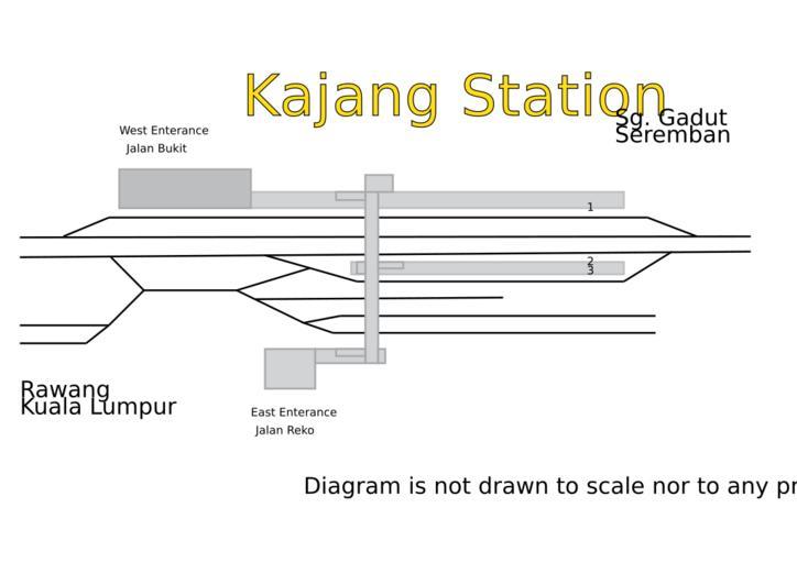 | Keywords: Ktmb kajang station platform layout.svg A layout of KTMB Kajang station Made using Adobe Illustrator CS5 Platform 1 ~ Seremban Sg Gadut bound komuter trains; North and South bound KTMB Intercity trains Platform 2 ~ Kuala Lumpur Rawang bound komuter trains Platform 3 ~ Auxillary platform used chiefly by ETS limited stop express train 2011-09-06 own assumed Saruman776 Check categories 2011 October 25 en wikipedia Kajang_railway_station KTM Komuter 6 Kajang Railway Station Rapid transit stations Selangor Railway lines in Malaysia KTM Komuter |