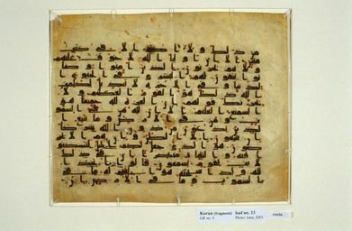 Keywords: Kufi - D IV style.jpg en Verses 61-73 of the 10th chapter of the Qur'an entitled Surat Yunus Jonah The text's Kufi script appears related to the D IV style typical of horizontal Qur'ans produced on parchment during the 9th century LOC-calligraphy ascs 291 Unknown Calligrapher century 9 PD-Art Qur'an manuscripts 9th century Library of Congress Arabic Persian and Ottoman calligraphy collection Kufic style |