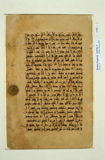 Keywords: Kufi script (New Style I) - Qur'anic verses.jpg en Verses 17-29 of the 48th chapter of the Qur'an entitled Surat al-Fath The Victory The text is executed in Kufi script on a beige sheet of paper rather than on parchment The script is in New Style I typical of vertical Qur'ans produced on paper during the 12th century http //memory loc gov/service/amed/ascs/281/0001 jpg Library of Congress Unknown Calligrapher century 12 PD-Art Kufic style Qur'an manuscripts 12th century Library of Congress Arabic Persian and Ottoman calligraphy collection |