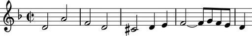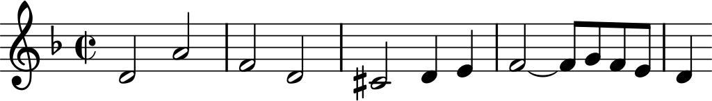 Keywords: Kunst der Fuge.svg Subject of Bach's The Art of Fugue own Wereon LilyPond source <pre> \version 2 12 1 \include english ly \header tagline \score \new Staff \relative c \clef treble \key d \minor \time 2/2 d 2 a' f d cs d4 e f2~ f8 g f e d4 </pre> The Art of Fugue |
