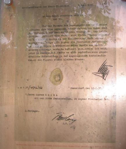 Keywords: Kunstsammlung Düsseldorf, Brief an den Oberbürgermeister, Bronzestatuen Ehrenhof, 1937.jpg Brief ausgestellt im Ehrenhof Düsseldorf Untertitelt Reproduziert von Jean Jacques Lebel im Rahmen seines Werkes Fà NF SKULPTUREN MINUS Zwei 2001 Kunstsammlungen der Stadt Düsseldorf 5 Febr 1937 Febr durchgestrichen An den Herrn Oberbürgermeister Amt 31 Vor der Fassade des Museumsgebäudes am Ehrenhof befinden sich vier weibliche Bronzestatuen von denen zwei von Gottschalk und zwei von Sopher stammen Vom letztgenannten befindet sich weiter eine Statue Wasserträgerin in dem kleinen Garten an der Rheinterrasse Nach meiner Kenntnis der Dinge gilt Sopher als Nichtarier dem seinerzeit die Ausübung des künstlerischen Berufs aus Rassegründen untersagt wurde M E dürfte es sich empfehlen eine grundsätzliche Entscheidung in der Sache herbeizuführen ob die Figuren stehen bleiben können Unterschrift Amt 31/4542/36 Düsseldorf den 10 2 37 1 Herrn Kustos Kocks mit der Bitte festzustellen ob Sopher Nichtarier ist 2 Vorlegen Unterschriften B V M own photo 1937-02-10 Kunstsammlungen der Stadt Düsseldorf Kürschner PD-text Fünf Figuren minus zwei Jean-Jacques Lebel Racism in Nazi Germany Documents of Düsseldorf |