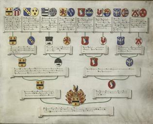 Keywords: Kwartierstaat met de wapens van de zestien kwartieren van Jan van de Poll Rijksmuseum SK-A-1277.jpeg accession number SK-A-1277 Anonymous credit line nl Kwartierstaat met de wapens van de zestien kwartieren van Jan van de Poll 1668-1745 van de Poll de Vroede Duivel Dommer van Gerwen van Maren van Warmond Brouwer Hooft Haak Houtlook Boswinkel Hasselaar Persijn van Schoterbosch en Kies Onderdeel van een groep van drie wapens behorend bij de schenking J S R van de Poll Arnhem 1885 SK-A-1276/1278 Onderdeel van de collectie heraldische objecten drager Height cm 57 drager Width cm 70 exhibition history Institution Rijksmuseum parchment ; ink ; watercolor object history Acquisition 1885-11-01 object type heraldisch object PD-US PD-old Data and photography rights All data and all images made available through the API are either in the public domain or are subject to a CC0 license https //www rijksmuseum nl/en/api/terms-and-conditions-of-use cc-zero place of creation Noordelijke Nederlanden http //www rijksmuseum nl/collectie/SK-A-1277 Kwartierstaat met de wapens van de zestien kwartieren van Jan van de Poll Q17323947 Uploaded with GWToolset Kwartierstaat met de wapens van de zestien kwartieren van Jan van de Poll Rijksmuseum SK-A-1277 http //www rijksmuseum nl/media/assets/SK-A-1277 Images uploaded by Fæ Images from the Rijksmuseum Paintings in the Rijksmuseum Amsterdam |