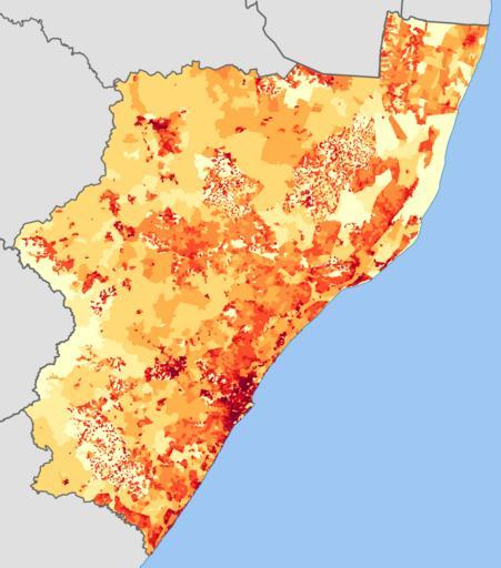 | Keywords: KwaZulu-Natal 2011 population density map.svg ffffcc <1 inhabitant/km² ffeda0 1 “3 inhabitants/km² fed976 3 “10 inhabitants/km² feb24c 10 “30 inhabitants/km² fd8d3c 30 “100 inhabitants/km² fc4e2a 100 “300 inhabitants/km² e31a1c 300 “1000 inhabitants/km² bc0026 1000 “3000 inhabitants/km² 800026 >3000 inhabitants/km² Projection is Albers Equal-Area Conic with standard parallels at 25 5° S and 31 5° S and origin at 28 5° S 25 5° E Statistics South Africa's Census 2011 is the source of the basic population data The map results from my own processing of the data Htonl 2013-10-22 http //beta2 statssa gov za/ page_id 425 The following license applies to the population data on which the map is based the user acknowledges Stats SA as the source of the basic data wherever they process apply utilise publish or distribute the data and also that they specify that the relevant application and analysis where applicable result from their own processing of the data The following tag applies to the map itself Demographic maps of South Africa Maps of KwaZulu-Natal |