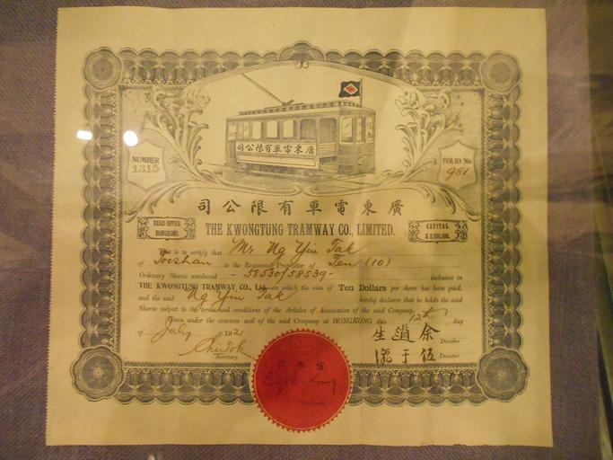 | Keywords: Kwongtung Tramway HK.JPG zh-hant 廣 電車 限公司(原廣州電車路公司)的股票, 廣 的英文以粵音拼寫 Kwongtung 1921 廣州孫中山大元帥 念館 The Kwongtung Tramway Co Ltd PD-Old Uploaded with UploadWizard Memorial Museum of the Generalissimo Sun Yat-sen's Mansion Transport in Guangzhou Historical images of Guangzhou Stock certificates Trams in China |