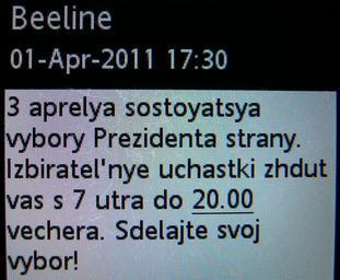 Keywords: KZelectionSMSinvitation.jpg en The snapshot of a mobile phone screen displaying an SMS with invitation to the Presidential election in Kazakhstan 2011 This official text was created by the Central Election Committee of Kazakhstan and due to it it is in public domain ru Снимок эк ана сотового телефона с SMS-сообщением п изывающим участвовать в голосовании на П езидентских выбо ах в Казахстане 2011 год Текст создан Цент альным изби ательным комитетом Казахстана и находится в общественном достоянии own snap by Ds02006 own snap by Ds02006 2011-04-01 PD-KZ-exempt Kazakhstan |