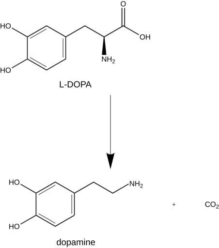 Keywords: L-DOPA-to-dopamine.svg en The reaction from L-DOPA to dopamine own Mys 721tx 2013-10-24 Dopamine Cc-zero