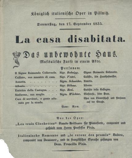 Keywords: La casa disabitata, cast list, 1835.jpg La casa disabitata at Pillnitz Castle Dresden Germany on 17 September 1835 17 September 1835 http //digital slub-dresden de/werkansicht/dlf/56322/3/ Princess Amalie of Saxony 1794-1870 other versions PD-old-100-1923 Amalie of Saxony 1794 “1870 |