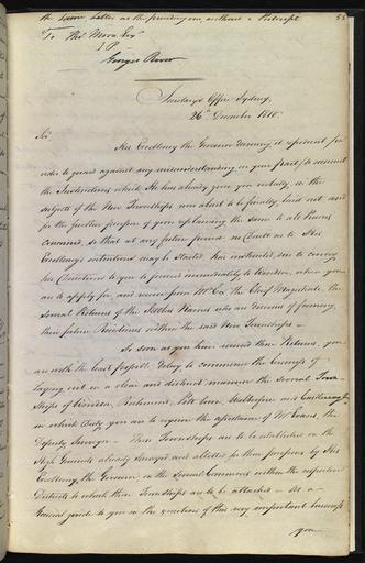 | Keywords: lachlan macquarie lachlanmacquarie governor archives state records nsw staterecordsnsw newsouthwales 26 december, 1810 26december1810 document writing text photo border texture monochrome Last month's highlight: Macquarie's instructions to James Meehan for the laying out of the Five Townships of Windsor, Richmond, Pitt town, Wilberforce and Castlereagh dated 26 December 1810. Notice Macquarie's attention to detail in the instructions: he sets a regular width for the streets and the assignment of land to be used for the Church, School, Gaol and Guard house. He even gives directions as to the type of dwelling houses which may be built. » Lachlan Macquarie Gallery FULL TRANSCRIPT Instructions given to James Meehan for the laying out of the Five Townships Secretary’s Office Sydney 26th December 1810 Sir His Excellency the Governor deeming it expedient/in order to guard against any misunderstanding on your part/to commit the Instructions which He has already given you verbally on the subjects of the New Townships now about to be finally, laid out and for the further purpose of your explaining the same to all persons concerned, so that at any future period, no doubt as to His Excellency’s intentions may be started, has instructed me to convey His directions to you to proceed immediately, to Windsor, where you are to apply for, and receive from Mr Cox the Chief Magistrate, the Several Returns of the Settlers Names who are desirous of forming their future Residences within the said New Townships So soon as you have received those Returns, you are with the least possible delay, to commence the business of laying out in a clear and distinct manner the Several Town- Ships of Windsor, Richmond, Pitt town, Wilberforce and Castlereagh in which duty you are to require the assistance of Mr Evans, the Deputy Surveyor. These Townships are to be established on the High Grounds already surveyed and allotted for those purposes by His Excellency, the Governor on the several Commons within the respective Districts to which these Townships are to be attached As a General guide to you in the execution of this very important business you 56 You are principally, to observe and follow the subsequent Rules and Orders in the marking out the several Townships and allotments for the Settlers who mean to reside therein 1st You are mark out the several Townships by regular lines accurately defined, and the streets to be laid out are to be 66 feet wide – those streets running lengthways thro’ the Town are to be parallel to, and 8 chains distant from each other – these streets are also to be intersected by others crossing them at right angles, which streets are to be the same width with the others, but are to be laid out 12 chains apart from each other, and are also to be in parallel directions 2 In the Center of each Town or Township you are to assign a Square Space of Ground containing 396 feet on each side for the purpose of erecting a Church, a School House, a Gaol and Guard House in and you are to set apart 2 acres of Ground on the rear of the central square for a Burial ground, with an expection in this particular with regard to Windsor and Richmond, instructions for which will be noticed herein. 3 The Townships are to be laid out in regular Allotments for the future Inhabitants in the Following proportions. Viz. Allotment For settlers holding Farms less than 30 1½ Acres For 57 Allotment For settlers holding Farms of 30 and less than 50 Acres 2 acres Do [Ditto] Do [Ditto] of 50 and less than 100 Do [Ditto] 3 Do [Ditto] Do [Ditto] Do [Ditto] of 100 acres and upwards 4 Do [Ditto] 4 But as there is not a sufficiency of unappropriated Land in the Township of Windsor to make the allotments equally great as the foregoing whilst that which is disposable becomes of course the more valuable, you are to make the distribution of it accordingly to the following scale namely Allotment For Settlers holding Farms less than 30 acres ¾ acre Do [Ditto] Do of 30 and less than 50 Acres 1 Do Do [Ditto] Do of 50 and less than 100 do 1½ Do Do [ Ditto] Do of 100 acres and Upwards 2 Do The main streets or those which run lengthways in Windsor are to be parallel and 5 Chains asunder, and the Streets at right angles with them or running cross- ways are to be 12 Chains apart and throughout paral- lel to each other the Width of the Streets to be 66 feet as in the other Townships Fifty acres of Ground are to be reserved for small Town allotments for the accom- modation of Tradesmen which Ground is to commence from Rickaby’s, Mr Marsden’s and Thomas’s farms and to extend thence to the Farms on the South Creek The allotments to be reserved for the settlers who have Farms on the Banks of the River are to commence at the termination of the 50 Acres reserved for the Tradespeople Every Person holding a Farm on the Bank of the River which is liable to the Floods, is to have an allotment assigned him, whether his Land is 58 is held by Grant or Lease from the Government or by Purchase or Lease from the original Grantee It is however to be clearly understood in this place that such allotments are never to be sold or alienated independent of the Farms for the security of which they are now first to be granted, nor is any Person whatever who holds Land on the River to get an allotment in a District Township but that wherein his Farm is situated to which he is to be exclusively attached and limited. 5 You are also to number the Farms on the banks of the Hawkesbury and Nepean which are subject to the floods in the same order they are placed on the Chart Viz No 1, 2, 3 and so on for their entire number and corresponding numbers for the Town allotment are to be given to the settlers, paying due attention to the proportions already prescribed When this duty is performed you are to make out a complete register off all the allotments thus assigned in order that it may be referred to in any Cases of dispute which may in future arise r