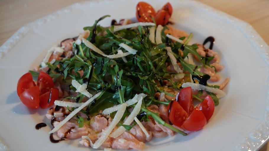 Keywords: lachscarpaccio rocket arugula parmesan tomatoes starter eat food salad vitamin yummy appetite
