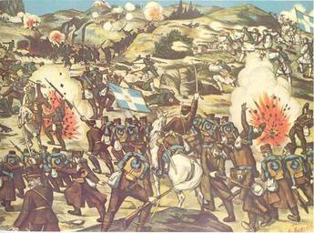 | Keywords: Lahanas1913.jpg  en Greek lithograph of the battle of Lachanas Second Balkan War 1913 el Λαϊκή λιθογραφία της  άχης του Κιλκίς 1913 Αθήνα Εθνικό και Ιστορικό  ουσείο/Athens National and Historical Museum Creator Sotirios Christidis 1913 Ιστορία του Ελληνικού Έθνους Εκδοτική Αθηνών Αθήνα 1980 Τόμος ΙΔ' σελ 341 Battle of Kilkis Lahanas Lithographs of Greece Sotirios Christidis PD-old |
