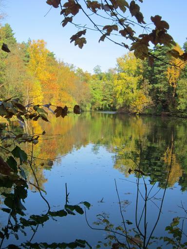 Keywords: lake autumn mirroring leaves water trees lighting forest plants lichtspiel sunbeam sunlight