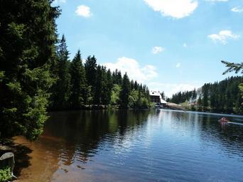 Keywords: lake brown green blue sky summer water sunny tree forest black forest germany stone pebble quiet holiday home